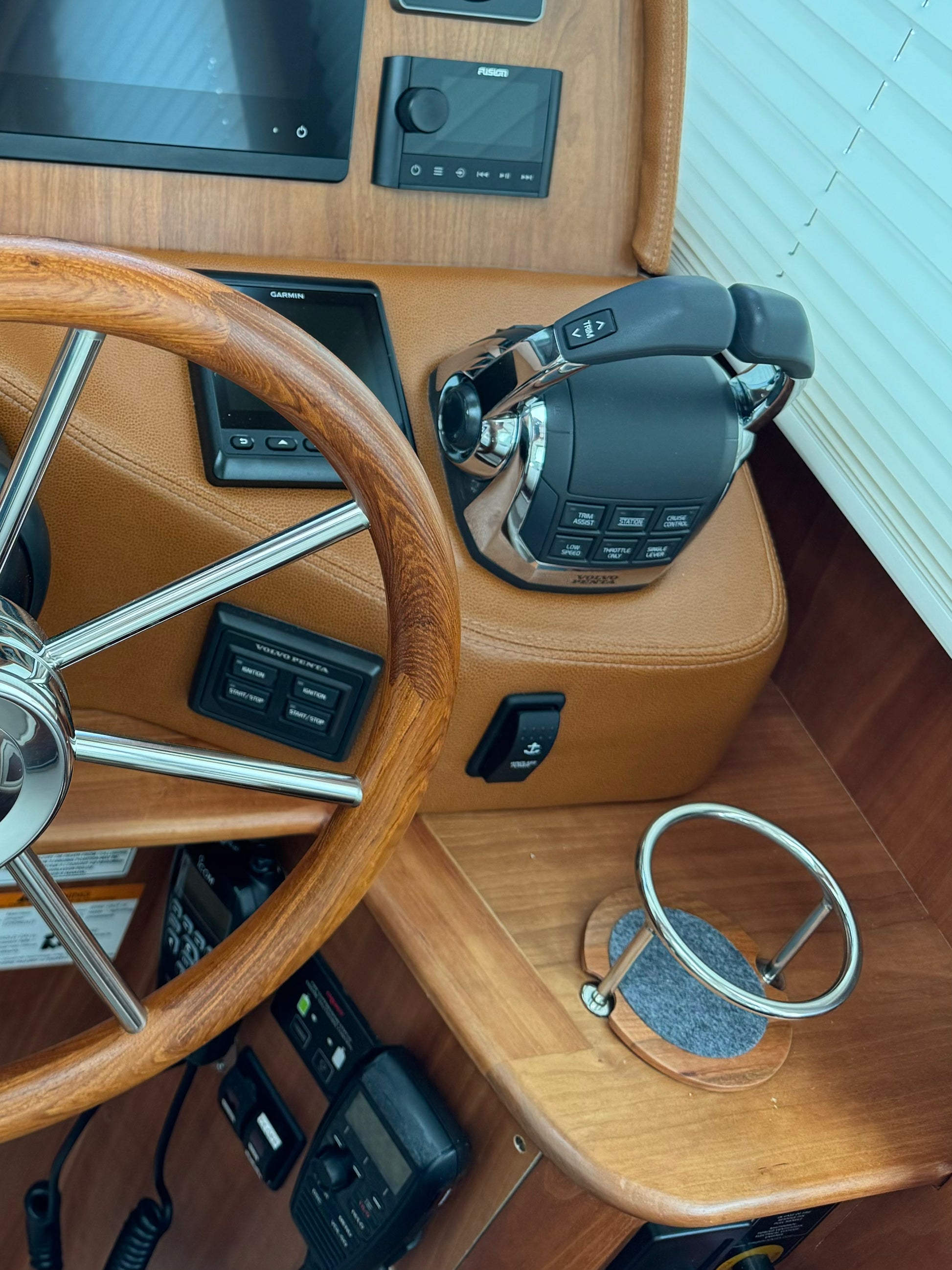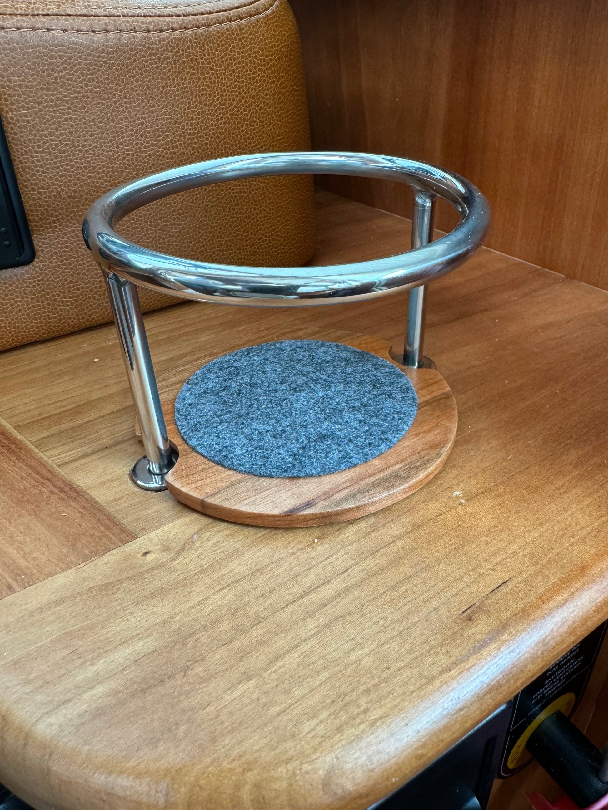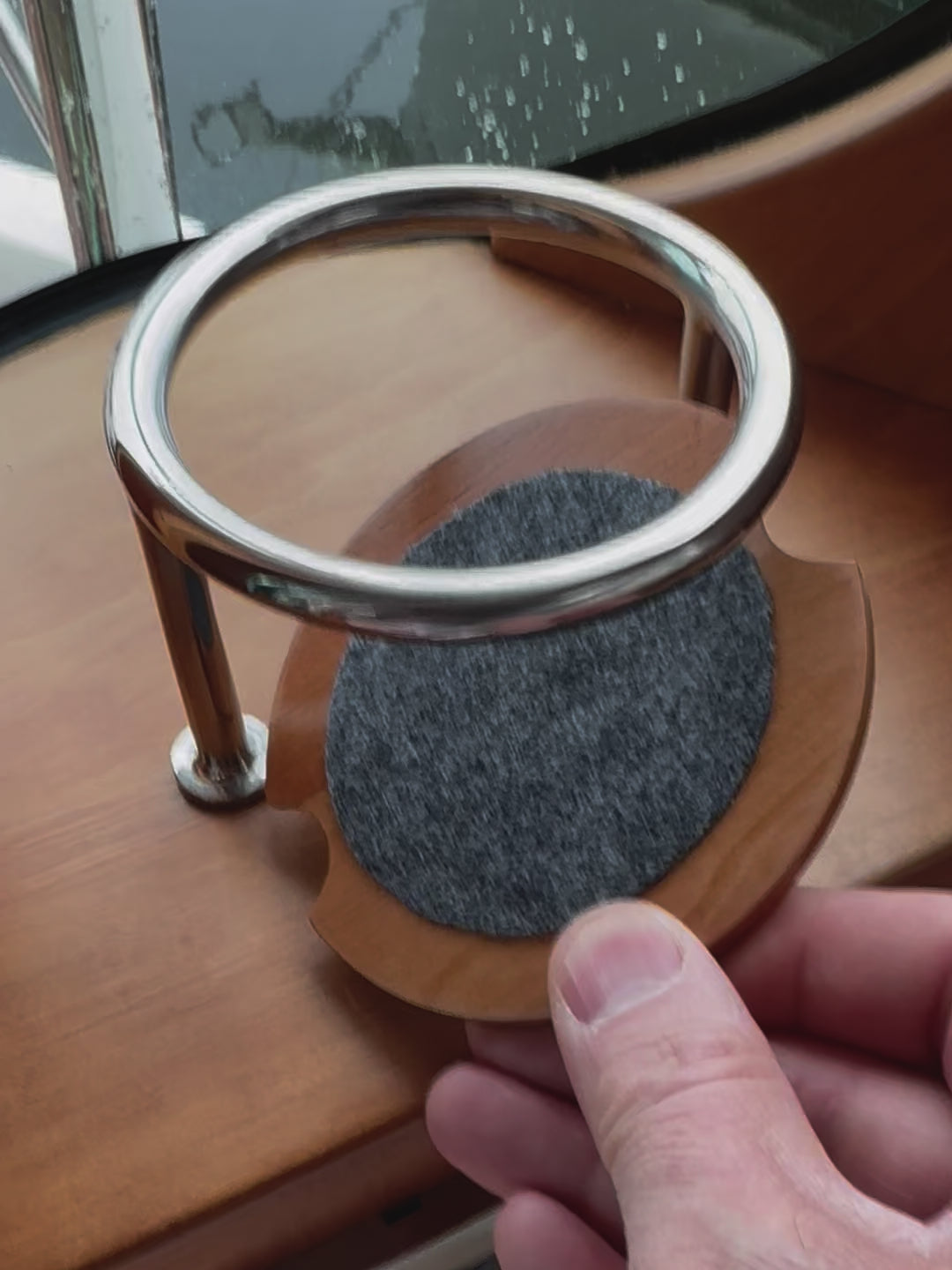 A fantastic way to protect your boats interior varnish and exterior gelcoat. Our single cup protector is made of solid cherry and semi-gloss finished. Thoughtful details include 4 super slim silicone dots on the bottom to slightly elevate the protector from your boats finishes, and applied felt on top to collect condensation. The protector is designed to fit with Sabre Yachts cup holders. To install the protector, simply insert it below the cup rings at an angle, and then drop into place (see our short video). The small semi-circular cutouts at the edges will register on the upright posts, keeping the protector in place in a seaway. An elegant way to keep metal and wet drink bottoms away from your beautiful yacht finishes. We developed and love using these on our own boat.